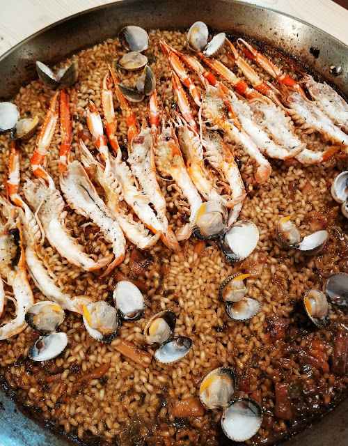 A revisar l'arròs: una mica cru i massa potent, amb bons punts de cocció per les escopinyes i els escamarlans. Com passa sovint, no estan integrats, sino afegits al final.