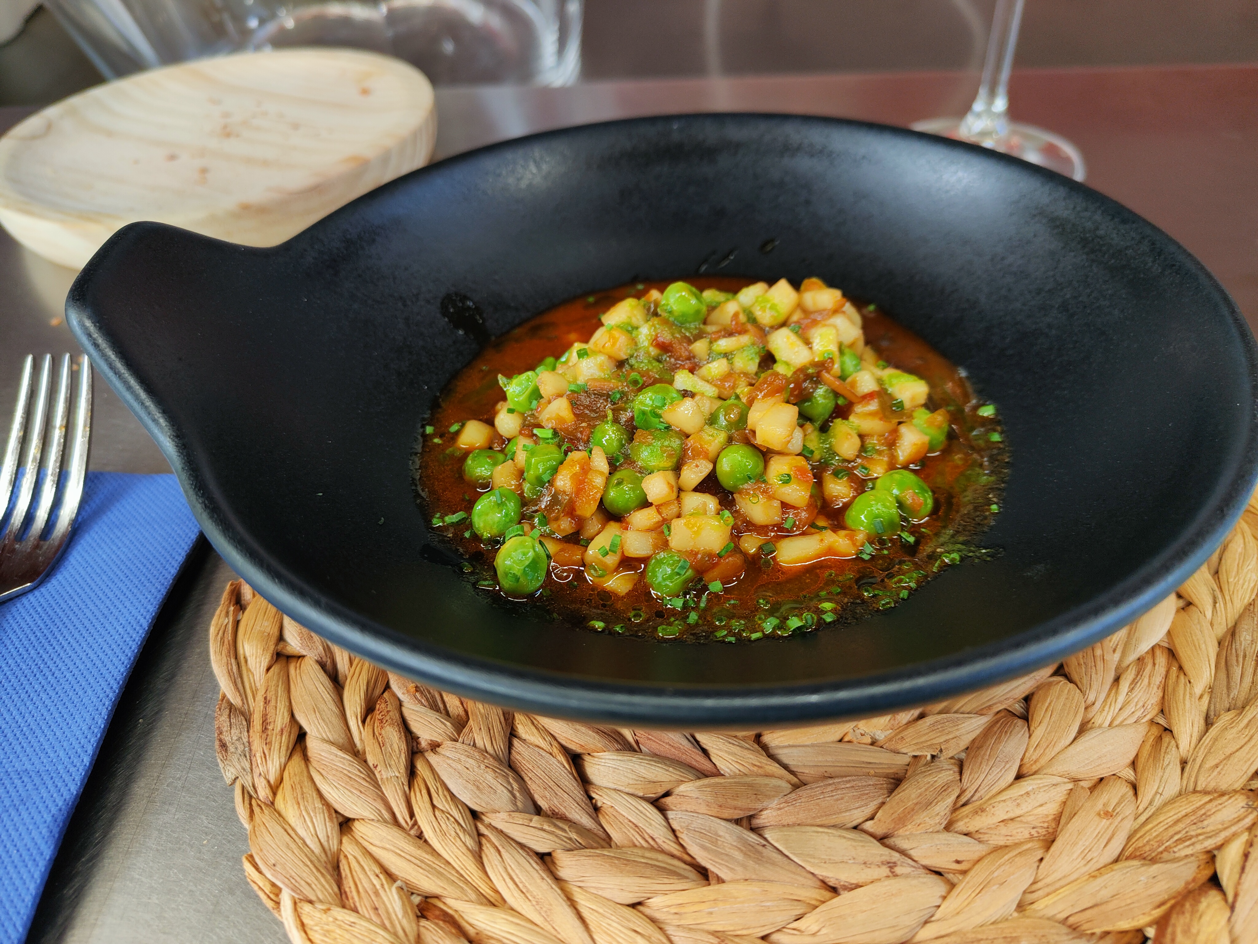 Los guisantes con sepia sirven a la idea de cocina plis plas gracias a que ha habido una buena preparación previa de fondos y caldos.