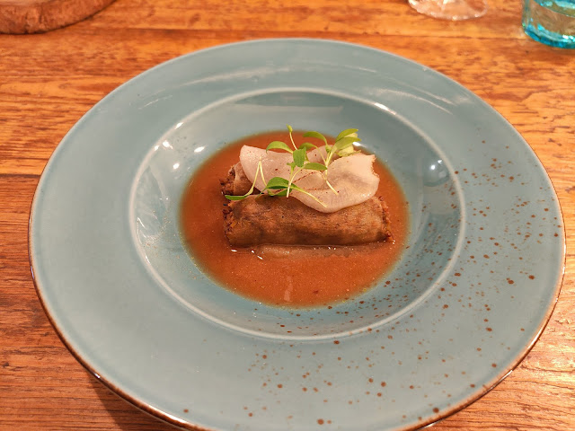 La única chicha es angus madurado y con especias indias: sirve de relleno a un canelón hecho con 'daikon', que necesita de una carne más melosa.